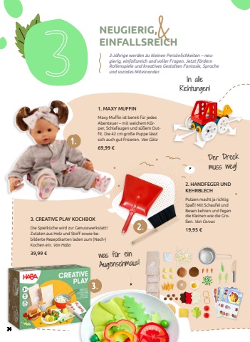 33 NEUGIERIG, EINFALLSREICH &3-J%u00e4hrige werden zu kleinen Pers%u00f6nlichkeiten %u2013 neugierig, einfallsreich und voller Fragen. Jetzt f%u00f6rdern Rollenspiele und kreatives Gestalten Fantasie, Sprache und soziales Miteinander.2 .3 .Der Dreck muss weg!In alle Richtungen!was f%u00fcr ein Augenschmaus!2. HANDFEGER UND KEHRBLECHPutzen macht ja richtig Spa%u00df! Mit Schaufel und Besen kehren und fegen die Kleinen wie die Gro%u00dfen. Von Corvus19,95 %u20ac1. MAXY MUFFINMaxy Muffin ist bereit f%u00fcr jedes Abenteuer %u2013 mit weichem K%u00f6rper, Schlafaugen und s%u00fc%u00dfem Outfit. Die 42 cm gro%u00dfe Puppe l%u00e4sst sich auch gut frisieren. Von G%u00f6tz69,99 %u20ac3. CREATIVE PLAY KOCHBOXDie Spielk%u00fcche wird zur Genusswerkstatt! Zutaten aus Holz und Stoff sowie bebilderte Rezeptkarten laden zum (Nach-) Kochen ein. Von Haba39,99 %u20ac1 .34