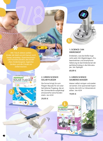 Mit 7 bis 8 Jahren wollen Kinder die Welt um sich herum noch besser verstehen. Experimentieren und Forschen f%u00f6rdern den kindlichen Entdeckergeist, logisches Denken und die Freude am Selbermachen.7/81. SCIENCE CAN MIKROSKOPEntdecken, was das blo%u00dfe Auge nicht sieht: Mit Objekttr%u00e4gern, Probeentnehmer und SmartphoneHalterung ist das Entdeckerset der perfekte Einstieg in die Mikroskopie. Von Topbright69,99 %u20ac3 .2 .1 .3. GREEN SCIENCE SAUBERES WASSERWasser selbst reinigen und wiederverwerten. Drei spannende Experimente, die nicht nur Wissensdurst stillen. Von HCM19,95 %u20ac2. GREEN SCIENCE SOLAR-FLIEGERDie Sonne bringt ihn zum Fliegen! Bausatz f%u00fcr ein solarbetriebenes Flugzeug, das an der Zimmerdecke aufgeh%u00e4ngt emissionsfrei seine Runden dreht. Von HCM29,95 %u20ac40
