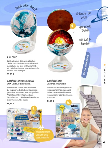 ZEIT F%u00dcR EXPERIMENTESCHALTKREISE, STROM UND ELEKTRIZIT%u00c4T6. PH%u00c4NOMINT GENIALE ROBOTERRoboter bauen leicht gemacht: Mit einfachen Materialien entstehen clevere Maschinen wie M%u00fcnzsortierer oder Eierklopfer. Von moses. 14,95 %u20ac4. GLOBUSDer leuchtende Globus zeigt au%u00dfen L%u00e4nder und Kontinente und %u00f6ffnet sich spektakul%u00e4r zur Erde im Querschnitt. Mit Lichtfunktion und interaktivem Infobereich. Von Topbright39,99 %u20ac5 .4 . spannendeDetailsEntdecke die Welt!mit Lichtfunktion5. PH%u00c4NOMINT DIE GROSSE BOX DER EXPERIMENTE Wie entsteht Strom? Hier %u00f6ffnet sich die faszinierende Welt der Elektrizit%u00e4t %u2013 ganz ohne Vorwissen, aber mit gro%u00dfem Aha-Effekt. Mit 24 hochwertigen Bauteilen und 22 kindgerecht erkl%u00e4rten Experimenten. Von moses.39,95 %u20ac 6 .Rund oder fach?41 TIPPS 7-8 JAHRE