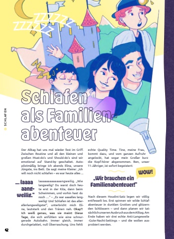 Der Alltag hat uns mal wieder fest im Griff. Zwischen Routine und all den kleinen und gro%u00dfen Must-do%u2019s und Should-do%u2019s sind wir emotional auf Stand-by geschaltet. Autopilotm%u00e4%u00dfig bringe ich abends Elina, unsere J%u00fcngste, ins Bett. Da sagt meine Kleine: %u201eIch will noch nicht schlafen %u2013 es war heute alles ...laaaaaaaaaaaaangweilig.%u2009%u2009%u201eWie langweilig? Du warst doch heute erst in der Kita, dann beim Schwimmen, und vorhin hast du noch %u2026%u201c %u2013 %u201eEs war aaaalles langweilig! Und Schlafen ist das allerallerlangweiligste!%u201c, unterbricht mich Elina, lautstark und den Tr%u00e4nen nah. Okay?! Ich wei%u00df genau, was sie meint DieseTage, die sich anf%u00fchlen wie eine schnurgerade Autobahn. Immer gleich, immerdurchgetaktet, null %u00dcberraschung. Uns fehlt echte Quality Time. Tine, meine Frau, kommt dazu, und vom ganzen Aufruhr angelockt, hat sogar mein Gro%u00dfer kurz die Kopf-h%u00f6rer abgenommen. Ben, unser 11-J%u00e4hriger, ist sofort begeistert: Nach diesem Houdini-Satz legen wir v%u00f6llig entfesselt los. Erst spinnen wir wilde Schlafabenteuer in dunklen Grotten und glitzernden Schl%u00f6ssern %u2013 und dann planen wir tats%u00e4chlich unseren Ausbruch aus dem Alltag. Am Ende haben wir drei echte Anti-Langeweile-Gute-Nacht-Settings %u2013 und die wollen ausprobiert werden.... laaaa aangweilig.%u201c Schlafen als FamilienabenteuerKommt alleKommt alleSCHLAFENzzzzzzzzzzzz%u201eWir brauchen ein Familienabenteuer!%u201c WOW!42