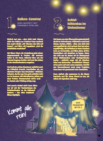 Einfach mal raus %u2013 aber nicht weit. Warum nicht den Balkon zur Outdoor-Oase machen? Ben meint direkt: %u201eWir k%u00f6nnten das Zelt aufbauen!%u201c, und Elina ruft begeistert: %u201eUnd die Schlafs%u00e4cke rausholen!%u201cWir Eltern feiern die Vorstellung jetzt schon: eingemummelt in Decken, mit warmem Kakao in der Hand, w%u00e4hrend %u00fcber uns der Himmel langsam dunkler wird und die Lichter in den Nachbarfenstern ausgehen.Und weil ein echtes Abenteuer nat%u00fcrlich auch ein Fr%u00fchst%u00fcck braucht, beschlie%u00dfen wir, am n%u00e4chsten Morgen Opa einzuladen %u2013 Br%u00f6tchen inklusive. By the way: Das geht nat%u00fcrlich nicht nur im Sommer. Mit W%u00e4rmflasche, M%u00fctze und einer Portion Abenteuerlust wird%u2019s auch im Herbst oder Fr%u00fchling richtig cosy.Und wenn%u2019s dunkel wird? Dann k%u00f6nnten wir mit der Taschenlampe ein Schattentheater an die Zeltwand zaubern %u2013 das w%u00e4re bestimmt Elinas Highlight.Wir bauen uns eine %u00dcbernachtungslandschaft direkt im Wohnzimmer. H%u00f6hlenbau next level. Kissen, Decken, St%u00fchle %u2013 alles, was nicht nietund nagelfest ist, wird verbaut. Ben hat schon angek%u00fcndigt, die Sofalehne in einen Drachenturm zu verwandeln, und Elina plant, all ihre Kuscheltiere mit einziehen zu lassen. Wenn das Licht aus ist, lassen wir im Hintergrund leises Waldrauschen oder Nachtger%u00e4usche laufen %u2013 vielleicht sogar mit ein bisschen Wind und Eulenrufen. Gruselfaktor? K%u00f6nnen wir je nach Lust und Laune anpassen. Und f%u00fcr den Sternenhimmel sorgt unser Projektor. Dazu lesen wir gemeinsam eine Geschichte. Dann einfach alle zusammen in die Kissen kuscheln und f%u00fcr einen Abend so tun, als w%u00e4ren wir irgendwo weit weg.Balkon- CampingM I N I - A U S Z E I T M I T FERNWEH-FEELINGSchlafh%u00f6hlenbau im WohnzimmerKommt alleKommt allerein!DAS PASSWORT BITTE :) SCHLAFEN43