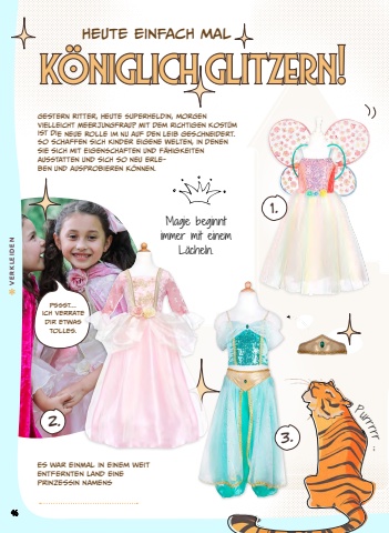 1.2. k%u00f6niglich glitzern!Heute einfach malMagie beginnt immer mit einem L%u00e4cheln.Es war einmal in einem weit entfernten Land eine Prinzessin namens Purrrrr ...Gestern Ritter, heute Superheldin, morgen vielleicht Meerjungfrau? Mit dem richtigen Kost%u00fcm ist die neue Rolle im Nu auf den Leib geschneidert. So schaffen sich Kinder eigene Welten, in denen sie sich mit Eigenschaften und F%u00e4higkeiten ausstatten und sich so neu erleben und ausprobieren k%u00f6nnen.3.Pssst... Ich verrate dir etwas tolles.46VERKLEIDEN