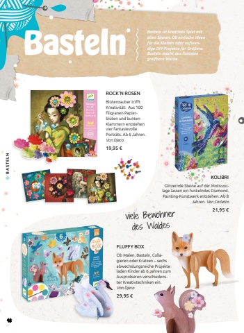 KOLIBRIGlitzernde Steine auf der Motivvorlage lassen ein funkelndes DiamondPainting-Kunstwerk entstehen. Ab 8 Jahren. Von Carletto21,95 %u20acFLUFFY BOXOb Malen, Basteln, Collagieren oder Kratzen %u2013 sechs abwechslungsreiche Projekte laden Kinder ab 6 Jahren zum Ausprobieren verschiedenster Kreativtechniken ein. Von Djeco29,95 %u20acROCK%u2018N ROSENBl%u00fctenzauber trifft Kreativit%u00e4t: Aus 100 filigranen Papierbl%u00fcten und bunten Klammern entstehen vier fantasievolle Portr%u00e4ts. Ab 6 Jahren. Von Djeco19,95 %u20acBasteln ist kreatives Spiel mit allen Sinnen. Ob einfache Ideen f%u00fcr die Kleinen oder aufwendige DIY-Projekte f%u00fcr Gr%u00f6%u00dfere: Basteln macht aus Fantasie Bastelngreifbare Werke.viele Bewohner des Waldes48BASTELN