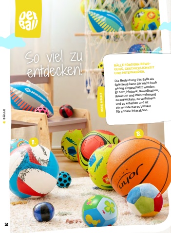 RUND & BUNT11 . 13 .So viel zu entdecken! B%u00c4LLE F%u00d6RDERN BEWEGUNG, GESCHICKLICHKEIT UND MITEINANDER.Die Bedeutung des Balls als Spielzeug kann gar nicht hoch genug eingesch%u00e4tzt werden. Er hilft, Motorik, Koordination, Reaktion und Wahrnehmung zu entwickeln, zu verfeinern und zu erhalten und ist ein wunderbares Vehikel f%u00fcr soziale Interaktion. 52B%u00c4LLE