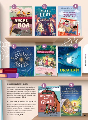 2 . 3 .9. 3 MINUTEN VORLESEGESCHICHTENPinguin Knut, Minischwein Marta, %u00c4ffchen Hicks der Steinbock Rocky sind unzertrennlich. Sie verlieren, streiten, r%u00e4tseln %u2013 und finden immer wieder zueinander. 66 kurze Geschichten zum Vorlesen und Einschlafen. Ab 4 J. Von Loewe 9,95 %u20ac4 .8. DAS NENNT MAN GL%u00dcCKWohnungsnot in Hamburg: F%u00fcr eine Familie mit f%u00fcnf Kindern scheint es keine Chance zu geben.Doch Janan und ihre Br%u00fcder k%u00e4mpfen mit Ideenreichtum und Ausdauer. Eine turbulente Familiengeschichte %u00fcber Zusammenhalt und Diversit%u00e4t. Ab 8 J. Von Gerstenberg 16,- %u20ac5 . 6 . 7.8 . 9 .55 BUCHTIPPS