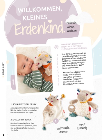2 .WILLKOMMEN, KLEINESErdenkind.SIGIKID1 .1. SCHNUFFELTUCH 29,95 %u20acAls ausgebildeter Schnuffelspezialist l%u00e4dt der kleine Drache zum Greifen und Entdecken ein. Von Sigikid2. SPIELUHRW 45,95 %u20acUnverzichtbarer Begleiter: Der kleine Drache ist Kuscheltier, Spieluhr und Einschlafhilfe in einem. Von Sigikid zuckers%u00fc%u00dfeDrachensuper kuscheligKrabbeln, lachen, wachsen. WENN DAS BABY DA IST, DREHT SICH DIE WELT PL%u00d6TZLICH ANDERSHERUM. Und der eigene Anspruch an Qualit%u00e4t schwingt sich in nie gekannte H%u00f6hen auf. Darum hei%u00dfen wir alle Neuank%u00f6mmlinge im ersten Lebensjahr mit einem Fest der guten Dinge willkommen. Bestens durchdacht, hochwertig und langlebig, geschaffen aus unbedenklichen Materialien und nat%u00fcrlich mit der Lizenz zum Fr%u00f6hlichsein.6HELLO BABY