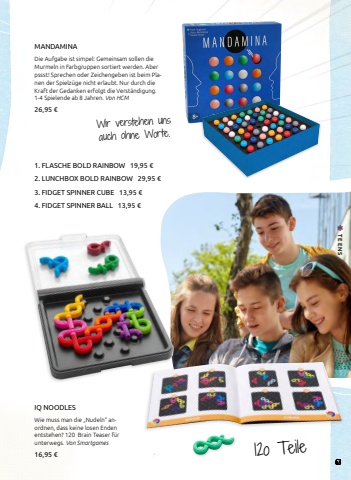MANDAMINADie Aufgabe ist simpel: Gemeinsam sollen die Murmeln in Farbgruppen sortiert werden. Aber pssst! Sprechen oder Zeichengeben ist beim Planen der Spielz%u00fcge nicht erlaubt. Nur durch die Kraft der Gedanken erfolgt die Verst%u00e4ndigung. 1-4 Spielende ab 8 Jahren. Von HCM26,95 %u20acWir verstehen uns auch ohne Worte.12o TeileIQ NOODLESWie muss man die %u201eNudeln%u201c anordnen, dass keine losen Enden entstehen? 120 Brain Teaser f%u00fcr unterwegs. Von Smartgames16,95 %u20ac1. FLASCHE BOLD RAINBOW 19,95 %u20ac2. LUNCHBOX BOLD RAINBOW 29,95 %u20ac3. FIDGET SPINNER CUBE 13,95 %u20ac4. FIDGET SPINNER BALL 13,95 %u20ac63TEENS