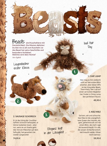 2. SAUSAGE SCHORSCHEr ist der K%u00f6nig der Couchkartoffeln! Schorsch behauptet, er k%u00f6nne Gedanken lesen %u2013 aber nur, wenn es um Snacks geht. Wer ihm ein Pl%u00e4tzchen auf dem Sofa gibt, hat garantiert nie wieder Langeweile!74,95 %u20ac1. CHIP JUMPMan mag es ihm vielleicht nicht auf den ersten Blick ansehen, aber dieser Affe ist der King jeder BeastTown-Party. Wer Lust auf einen verr%u00fcckten Begleiter hat, findet in Chimp Jump den perfekten Freund. 49,95 %u20ac3. KIEZ MIEZSie kam, sah und schnurrte. Kiez Miez ist die unangefochtene Queen des Viertels, elegant, geheimnisvoll und mit einem Blick, der mehr sagt als tausend Mauze. F%u00fcr alle, die wissen: Echte Pers%u00f6nlichkeit braucht weder Glitzer noch Glamour.59,95 %u20acbad Hair DayBeasts sind Kuscheltiere mit Pers%u00f6nlichkeit. Die Mission dahinter: Du bist nie zu alt zum Kuscheln! Jedes Beast hat seine Geschichte und besondere Vorlieben. Welches wird dein Homie?Von SigikidEleganz liegt in der L%u00e4ssigkeit ... Liegenbleiber erster Klasse1 .2 .3 .64
