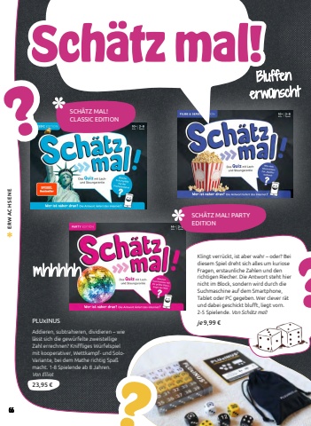 ???Klingt verr%u00fcckt, ist aber wahr %u2013 oder? Bei diesem Spiel dreht sich alles um kuriose Fragen, erstaunliche Zahlen und den richtigen Riecher. Die Antwort steht hier nicht im Block, sondern wird durch die Suchmaschine auf dem Smartphone, Tablet oder PC gegeben. Wer clever r%u00e4t und dabei geschickt blufft, liegt vorn. 2-5 Spielende. Von Sch%u00e4tz mal!PLUxINUS je 9,99 %u20acAddieren, subtrahieren, dividieren %u2013 wie l%u00e4sst sich die gew%u00fcrfelte zweistellige Zahl errechnen? Kniffliges W%u00fcrfelspiel mit kooperativer, Wettkampf- und SoloVariante, bei dem Mathe richtig Spa%u00df macht. 1-8 Spielende ab 8 Jahren. Von Elliot23,95 %u20acSCH%u00c4TZ MAL! CLASSIC EDITIONmhhhhh ...Bluffen erw%u00fcnschtSch%u00e4tz mal! SCH%u00c4TZ MAL! PARTY EDITION66ERWACHSENE