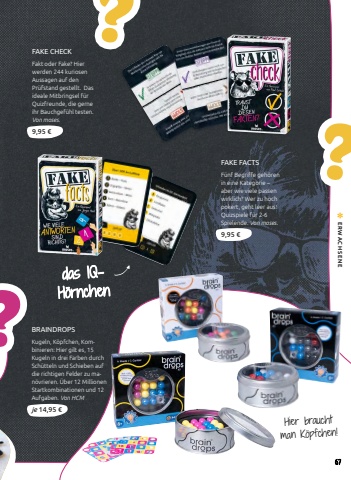 ???FAKE CHECKFakt oder Fake? Hier werden 244 kuriosen Aussagen auf den Pr%u00fcfstand gestellt. Das ideale Mitbringsel f%u00fcr Quizfreunde, die gerne ihr Bauchgef%u00fchl testen.Von moses.9,95 %u20acFAKE FACTSF%u00fcnf Begriffe geh%u00f6ren in eine Kategorie %u2013 aber wie viele passen wirklich? Wer zu hoch pokert, geht leer aus! Quizspiele f%u00fcr 2-6 Spielende. Von moses.9,95 %u20acBRAINDROPS Kugeln, K%u00f6pfchen, Kombinieren: Hier gilt es, 15 Kugeln in drei Farben durch Sch%u00fctteln und Schieben auf die richtigen Felder zu man%u00f6vrieren. %u00dcber 12 Millionen Startkombinationen und 12 Aufgaben. Von HCMje 14,95 %u20acHier braucht man K%u00f6pfchen!das IQH%u00f6rnchen67ERWACHSENE