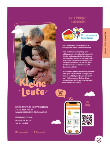 KLEINE LEUTE MAGAZINpurzmurzel PurzmurzelWEBSHOP da lang1001 Spielideen f%u00fcr jedes Alter + %u00f6kologische Baby- und KindermodeVom ersten Baby-Greifling %u00fcber p%u00e4dagogisch wertvolles Spielzeug f%u00fcr Kinder und Jugendliche f%u00fcr drinnen und drau%u00dfen bis hin zu hochwertigen Brett- und Gesellschaftsspielen. F%u00fcr Erwachsene finden Sie bei uns eine breite Auswahl an Spielideen und Geschenkartikeln. In unserem Laden f%u00fchren wir au%u00dferdem eine gro%u00dfe Auswahl an %u00f6kologischer Kinder-und Babymode von Gr%u00f6%u00dfe 44 bis 140. In unserem Online-Shop pr%u00e4sentieren wir Ihnen eine Auswahl aus unserem Sortiment.BAHNHOFSTR. 17 %u00b7 82377 PENZBERGTEL.: 0 88 56 / 30 01WWW.PURZMURZEL-SPIELHAUS.DE%u00d6FFNUNGSZEITEN:MO. BIS FR. 9 %u2013 18SA. 9 %u2013 14 UHRIhr Lieblings- Fachh%u00e4ndler