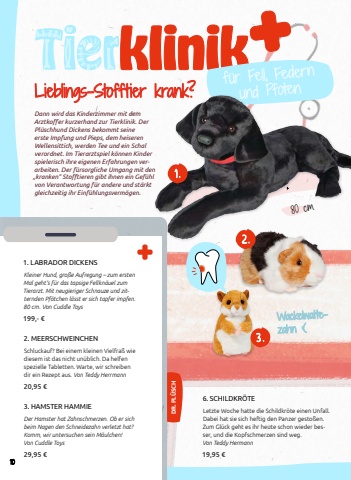 DR. PL%u00dcSCHLieblings-Stofftier krank?80 cmDann wird das Kinderzimmer mit dem Arztkoffer kurzerhand zur Tierklinik. Der Pl%u00fcschhund Dickens bekommt seine erste Impfung und Pieps, dem heiseren Wellensittich, werden Tee und ein Schal verordnet. Im Tierarztspiel k%u00f6nnen Kinder spielerisch ihre eigenen Erfahrungen verarbeiten. Der f%u00fcrsorgliche Umgang mit den %u201ekranken%u201c Stofftieren gibt ihnen ein Gef%u00fchl von Verantwortung f%u00fcr andere und st%u00e4rkt gleichzeitig ihr Einf%u00fchlungsverm%u00f6gen.6. SCHILDKR%u00d6TELetzte Woche hatte die Schildkr%u00f6te einen Unfall.Dabei hat sie sich heftig den Panzer gesto%u00dfen. Zum Gl%u00fcck geht es ihr heute schon wieder besser, und die Kopfschmerzen sind weg. Von Teddy Hermann19,95 %u20ac1. LABRADOR DICKENS Kleiner Hund, gro%u00dfe Aufregung %u2013 zum ersten Mal geht%u2019s f%u00fcr das tapsige Fellkn%u00e4uel zum Tierarzt. Mit neugieriger Schnauze und zitternden Pf%u00f6tchen l%u00e4sst er sich tapfer impfen. 80 cm. Von Cuddle Toys199,- %u20ac2. MEERSCHWEINCHENSchluckauf? Bei einem kleinen Vielfra%u00df wie diesem ist das nicht un%u00fcblich. Da helfen spezielle Tabletten. Warte, wir schreiben dir ein Rezept aus. Von Teddy Herrmann20,95 %u20ac2 .3. HAMSTER HAMMIEDer Hamster hat Zahnschmerzen. Ob er sich beim Nagen den Schneidezahn verletzt hat? Komm, wir untersuchen sein M%u00e4ulchen! Von Cuddle Toys29,95 %u20acWackelwattezahn :( 3 .Tierklinikf%u00fcr Fell, Federn und Pfoten1 .10