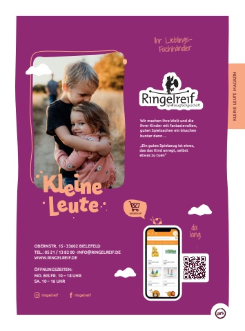 KLEINE LEUTE MAGAZINOBERNSTR. 15 %u00b7 33602 BIELEFELDTEL.: 05 21 / 13 82 00 %u00b7 INFO@RINGELREIF.DEWWW.RINGELREIF.DE%u00d6FFNUNGSZEITEN:MO. BIS FR. 10 %u2013 18 UHRSA. 10 %u2013 16 UHRringelreif ringelreifWir machen Ihre Welt und die Ihrer Kinder mit fantasievollen, guten Spielsachen ein bisschen bunter denn ...%u201eEin gutes Spielzeug ist eines, das das Kind anregt, selbst etwas zu tuen%u201cWEBSHOP da langIhr Lieblings- Fachh%u00e4ndler