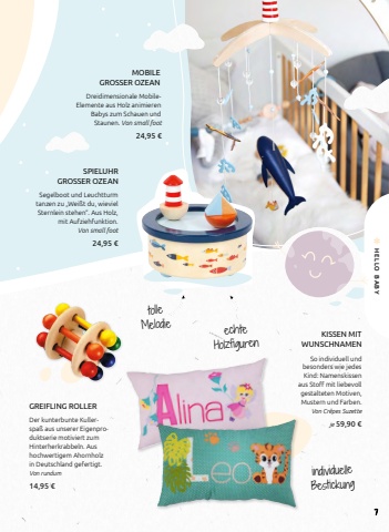 KISSEN MIT WUNSCHNAMEN So individuell und besonders wie jedes Kind: Namenskissen aus Stoff mit liebevoll gestalteten Motiven, Mustern und Farben. Von Cr%u00eapes Suzetteje 59,90 %u20acGREIFLING ROLLERDer kunterbunte Kullerspa%u00df aus unserer Eigenproduktserie motiviert zum Hinterherkrabbeln. Aus hochwertigem Ahornholz in Deutschland gefertigt. Von rundum14,95 %u20acMOBILE GROSSER OZEANDreidimensionale MobileElemente aus Holz animieren Babys zum Schauen und Staunen. Von small foot24,95 %u20acSPIELUHR GROSSER OZEANSegelboot und Leuchtturm tanzen zu %u201eWei%u00dft du, wieviel Sternlein stehen%u201c. Aus Holz, mit Aufziehfunktion. Von small foot24,95 %u20acechte Holzfigurenindividuelle Bestickungtolle Melodie7HELLO BABY