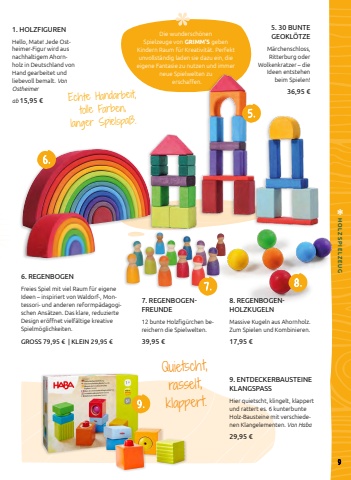 6 .Die wundersch%u00f6nen Spielzeuge von GRIMM%u2019S geben Kindern Raum f%u00fcr Kreativit%u00e4t. Perfekt unvollst%u00e4ndig laden sie dazu ein, die eigene Fantasie zu nutzen und immer neue Spielwelten zu erschaffen.5. 30 BUNTE GEOKL%u00d6TZEM%u00e4rchenschloss, Ritterburg oder Wolkenkratzer %u2013 die Ideen entstehen beim Spielen!36,95 %u20ac6. REGENBOGENFreies Spiel mit viel Raum f%u00fcr eigene Ideen %u2013 inspiriert von Waldorf-, Montessori- und anderen reformp%u00e4dagogischen Ans%u00e4tzen. Das klare, reduzierte Design er%u00f6ffnet vielf%u00e4ltige kreative Spielm%u00f6glichkeiten.GROSS 79,95 %u20ac | KLEIN 29,95 %u20ac7. REGENBOGENFREUNDE12 bunte Holzfig%u00fcrchen bereichern die Spielwelten.39,95 %u20ac8. REGENBOGENHOLZKUGELNMassive Kugeln aus Ahornholz. Zum Spielen und Kombinieren.17,95 %u20ac1. HOLZFIGURENHello, Mate! Jede Ostheimer-Figur wird aus nachhaltigem Ahornholz in Deutschland von Hand gearbeitet und liebevoll bemalt. Von Ostheimerab 15,95 %u20acQuietscht,rasselt,klappert.Echte Handarbeit, tolle Farben, langer Spielspa%u00df.9. ENTDECKERBAUSTEINE KLANGSPASSHier quietscht, klingelt, klappert und rattert es. 6 kunterbunte Holz-Bausteine mit verschiedenen Klangelementen. Von Haba29,95 %u20ac5 .7 .9 .8 .9 HOLZSPIELZEUG